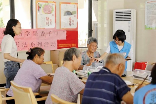 7月16日上午,15vip太阳集团“医行荔湖 同心逐梦”社会实践队联合荔湖街社工站开展了“老有所学,书写人生”第五节长者书法课程。15vip太阳集团宋云旨老师来到本节课堂,带领长者一起学习“吉祥享清福”的毛笔书写。虽然书法课程只有短短几天,长者们的书法却大有进步。队员们的温馨陪伴,给长者们带来了欢声笑语。