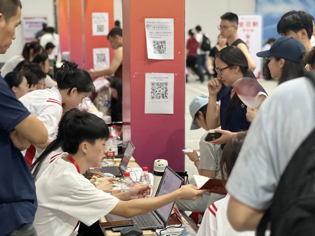 “同学,这边扫码,备注好班级姓名。”负责物品发放处的志愿者友善亲切,认真工作、耐心解答抚平萌新的焦虑与不安。