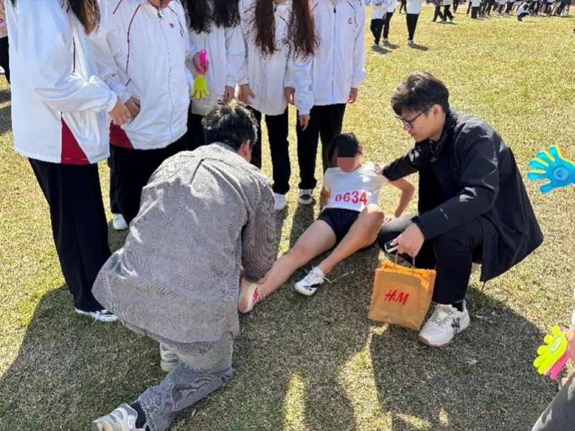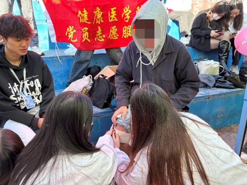 服务队的志愿者为运动会中的伤员进行伤口包扎。