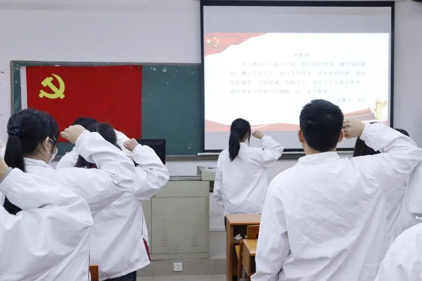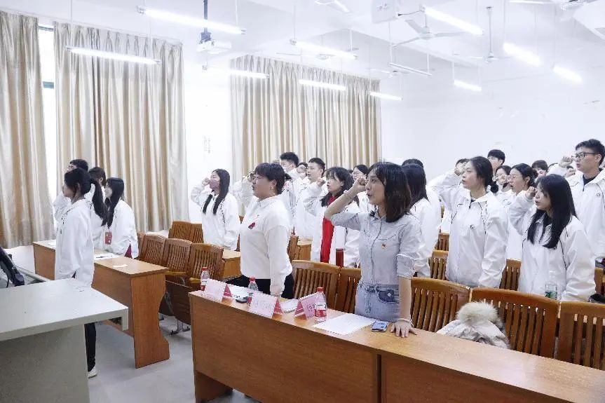 14位预备党员进行入党宣誓,所有党员一起重温入党誓词,全体起立,由曾梓玲同志上台领誓。